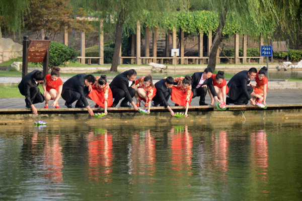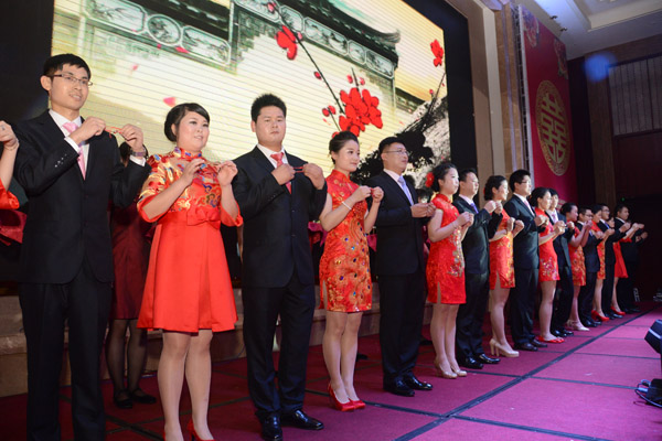 在紅豆,有著無數個這樣的故事等待我們挖掘。這些紅豆人因為紅豆情文化而扎根企業,從而也吸引更多的人選擇在紅豆扎根。紅豆是有形的情,在紅豆,每個員工都會感受到家庭溫暖。此次紅豆樹下的婚禮,紅豆為紅豆員工打造美輪美奐的婚禮,精心安排各種獨具紅豆特色的環節。鵲橋相會、恩愛宣誓、紅豆樹下鎖同心、新人共放荷花燈,紅豆情緣等等系列戶外儀式,演繹著新人相識相戀相愛的浪漫故事。紅豆集團還為新人們送上紅豆緣定制首飾、定制旗袍、紅豆形象男裝等具有濃厚中國風的新婚賀禮,共邀新人的親朋好友參加這場最浪漫的新中式集體婚禮,以紅豆之名見證最美的愛情。