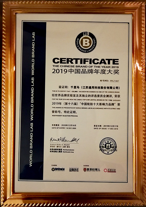 On December 17, 2019, the selection of the "China Brand Annual Awards" 2019 hosted by the world's authoritative organization, the World Brand Lab, was announced in Beijing. The "CELIMO TIRES" of General Science won the "Top Ten Chinese Tire Brands in 2019".