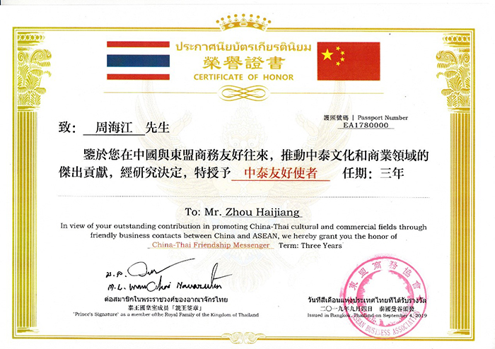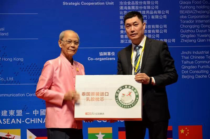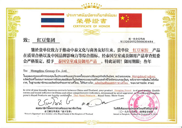 2019年9月4日,紅豆集團(tuán)紅豆家紡公司應(yīng)邀參加2019年?yáng)|盟經(jīng)貿(mào)發(fā)展(曼谷)合作論壇,紅豆家紡公司總經(jīng)理錢(qián)振宇先生帶領(lǐng)一行人員參加此次會(huì)議,紅豆家紡首次走出國(guó)門(mén),詮釋對(duì)健康水碾、舒適生活的全新定義,從而引領(lǐng)健康睡眠的需求。在此次會(huì)議上,紅豆家紡公司總經(jīng)理向泰國(guó)旺猜親王進(jìn)貢紅豆乳膠枕、紅豆襯衫,獲得皇室旺猜親王的高度評(píng)價(jià),并授予紅豆集團(tuán)紅豆家紡產(chǎn)品為“泰國(guó)皇室御用產(chǎn)品”。同時(shí),錢(qián)振宇先生代表紅豆集團(tuán)董事局主席兼CEO周海江,接受中泰國(guó)王勛章,中泰友好使者榮譽(yù)。