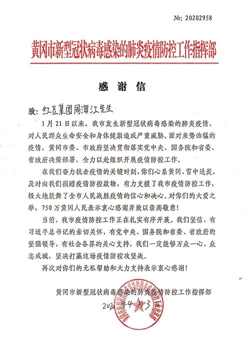 近日,湖北省“黃岡市疫情防控工作指揮部”給紅豆集團(tuán)黨委書記、董事局主席兼CEO周海江發(fā)來(lái)感謝信,信中說(shuō),“在我們奮力抗擊疫情的關(guān)鍵時(shí)刻,你們心系黃岡、雪中送炭,及時(shí)向我們捐贈(zèng)疫情防控款物,有力支援了我市疫情防控工作,極大地鼓舞了全市人民戰(zhàn)勝疫情的信心和決心。對(duì)你們的大愛之舉,750萬(wàn)黃岡人民表示衷心感謝并致以崇高敬意!”