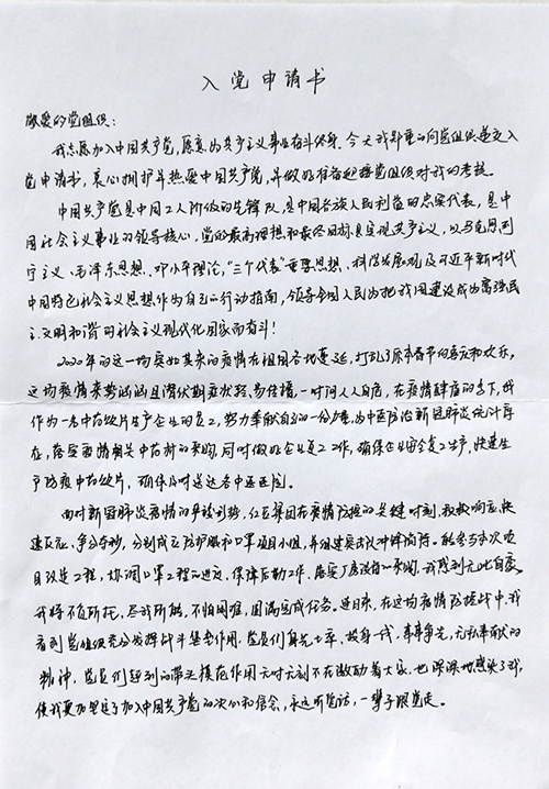 紅豆集團國際公司的員工梁艷的再次向黨組織遞交入黨申請書的原因很簡單,“為了支持一線疫情防控,集團緊急組建黨員突擊隊支援防護服、口罩生產(chǎn)線,負(fù)責(zé)最緊急、最艱苦的工作。我也報名了,因我還不是黨員,所以沒有把最重的任務(wù)安排給我。”受到身邊黨員的激勵,讓梁艷鼓起勇氣,擬出了這份“疫情火線入黨申請書”。